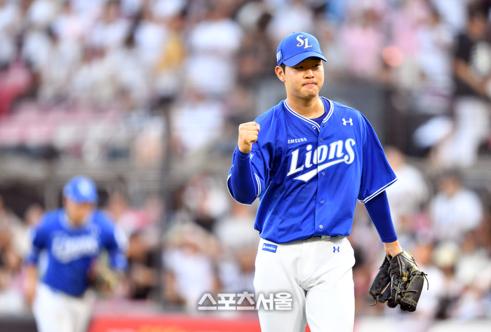삼성 선발투수 황동재가 30일 수원KT위즈파크에서 열리는 2024 프로야구 KT위즈와 삼성라이온즈 더블헤더 2차전 4회말 무실점으로 이닝을 마무리하며 주먹을 불끈 쥐쳐 자축하고 있다. 2024.06.30.