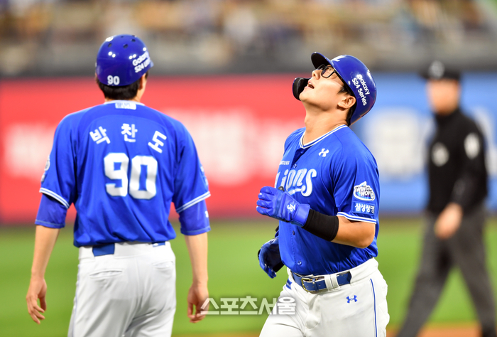 삼성 7번타자 윤정빈이 30일 수원KT위즈파크에서 열리는 2024 프로야구 KT위즈와 삼성라이온즈 더블헤더 2차전 7회초 잘맞은 타구가 펜스앞에서 잡히자 아쉬워하고 있다. 2024.06.30.
