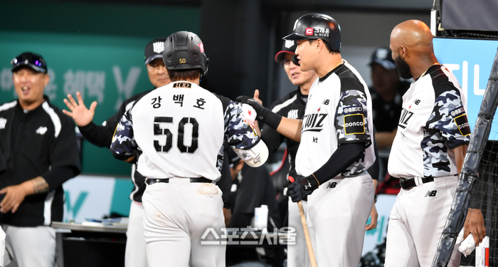 KT 2번타자 강백호가 30일 수원KT위즈파크에서 열리는 2024 프로야구 KT위즈와 삼성라이온즈 더블헤더 2차전 8회말 1사 후 김재윤을 상대로 우중�� 솔로홈런을 터트린 후 홈인하고 있다. 2024.06.30.