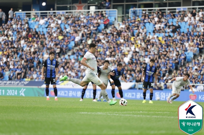강원은 전반 13분 문전에서 야고가 인천 수비수 요니치에게 걸려 넘어졌다. 주심은 비디오 판독(VAR) 끝에 페널티킥을 선언했다. 직접 키커로 나선 야고의 슛이 크로스 바를 강타했다. 강원은 시종일관 인천을 밀어붙였다. 전반 25분 조진혁의 왼발 슛은 골대를 벗어났다.