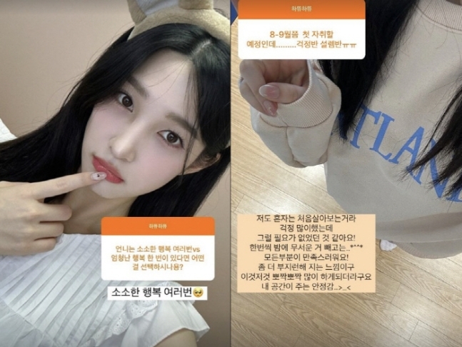 공개된 사진 속 율희는 개인채널 속 ‘무엇이든 물어보세요’ 기능을 통해 팬들과 함께 소통하고 있었다. 율희는 “8~9월 쯤 첫 자취할 예정인데 걱정반 설렘반”이라는 팬의 질문에 “저도 혼자는 처음 살아보는 거라 걱정 많이 했는데 그럴 필요가 없었던 것 같다”고 말했다.