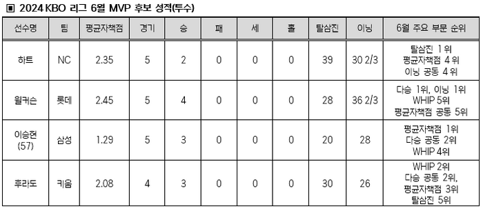 6월의 윌커슨(롯데)은 4일 광주 KIA 전에서 9이닝 무사사구 피칭으로 2024 KBO 리그 1호 완봉승을 기록하며 6월을 화려하게 시작했다. 이후 4번의 등판에서도 3번을 7이닝 이상 투구했고, 5번의 등판 중 4번의 퀄리티스타트 기록으로 4승을 챙겼다.