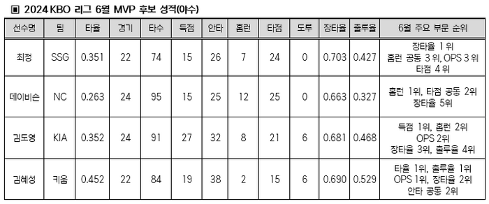 KBO는 “2024 신한 SOL뱅크 KBO 리그 6월 월간 MVP 후보로 총 8명의 선수가 확정됐다”며 “투수 중에서는 NC 하트, 롯데 윌커슨, 삼성 이승현, 키움 후라도, 야수 중에서는 SSG 최정, NC 데이비슨, KIA 김도영, 키움 김혜성이 후보로 선정돼 6월 MVP 수상을 노린다”라고 전했다.