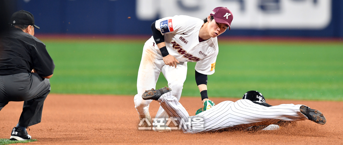 키움 2루수 김혜성이 2일 고척스카이돔에서 열리는 2024 프로야구 키움히어로즈와 LG트윈스의 경기 7회초 1사 1루 8번 구본혁 타석때 2루도루를 시도하는 김대원을 태그아웃시키고 있다. 2024.07.02.