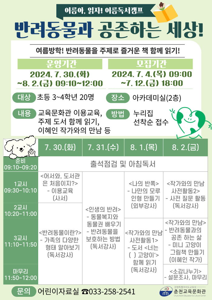 자세한 사항은 춘천교육문화관 누리집 공지 사항을 참고하거나 어린이자료실(☎033-258-2541)로 문의하면 된다.