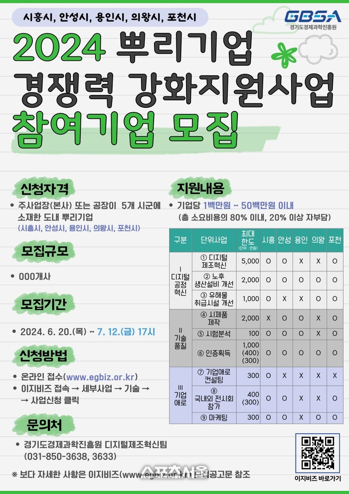 〔스포츠서울│수원=좌승훈기자〕경기도경제과학진흥원은 ‘ 뿌리기업 경쟁력 강화 지원 2차’ 참여기업을 오는 12일까지 모집한다고 3일 밝혔다.
