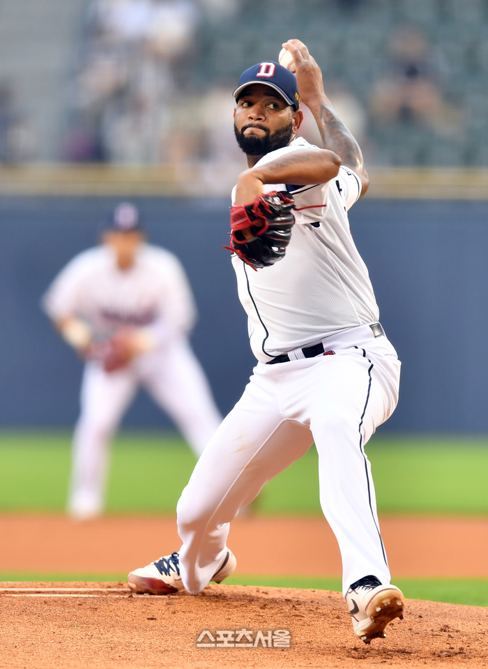 두산 우완투수 알칸타라가 3일 잠실구장에서 열리는 2024 프로야구 두산베어스와 롯데자이언츠 경기에서 선발로 나서 힘껏 공을 던지고 있다. 2024.07.03.
