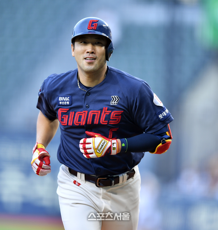 롯데 3번타자 전준우가 3일 잠실구장에서 열리는 2024 프로야구 두산베어스와 롯데자이언츠 경기 1회초 2사후 알칸타라를 상대로 좌월 솔로홈런을 터트린 후 홈인하고 있다. 2024.07.03.