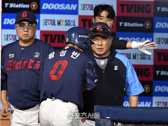 롯데 황성빈이 3일 잠실구장에서 열리는 2024 프로야구 두산베어스와 롯데자이언츠 경기 6회초 2사 만루 대타 이정훈의 밀어내기 볼넷으로 득점한 후 김태형 감독과 김광수 코치의 축하를 받고 있다. 2024.07.03.