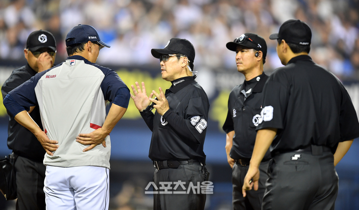 두산 이승엽 감독이 3일 잠실구장에서 열리는 2024 프로야구 두산베어스와 롯데자이언츠 경기 6회말 심판들의 합의 후 조수행의 아웃이 선언되자 그라운드에 나와 상황을 어필한 후 박근영 심판의 설명을 듣고 더그아웃으로 돌아가고 있다. 2024.07.03.