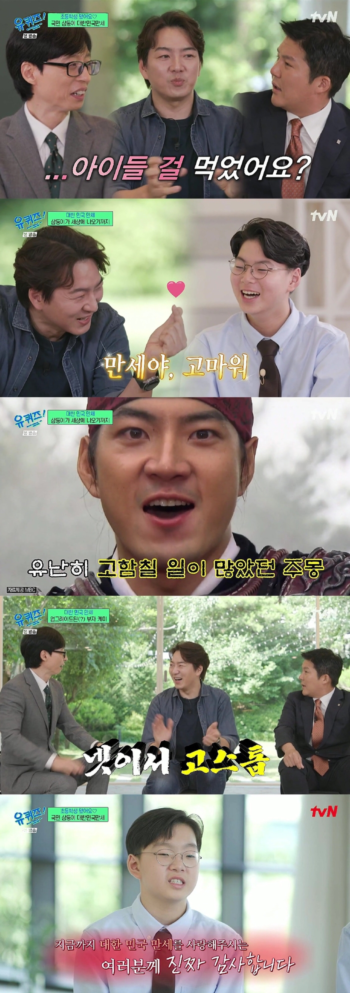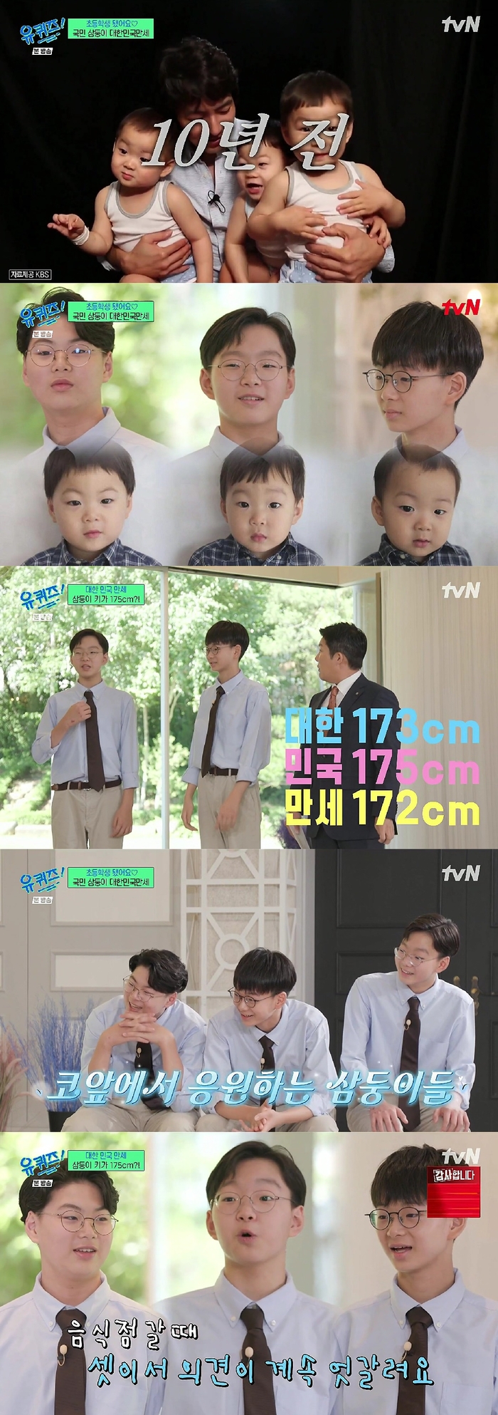 3일 방송된 tvN ‘유퀴즈 온 더 블럭’에서 송일국이 초등학교 6학년이 된 삼둥이와 함께 출연했다. 2014년 KBS2 ‘슈퍼맨이 돌아왔다’(이하 ‘슈돌’)에 출연했던 삼둥이는 어린 시절 얼굴이 고스란히 남은 채로 키가 170cm 넘게 훌쩍 자랐고, 안경에 넥타이를 한 채 훈훈한 외모를 과시했다.