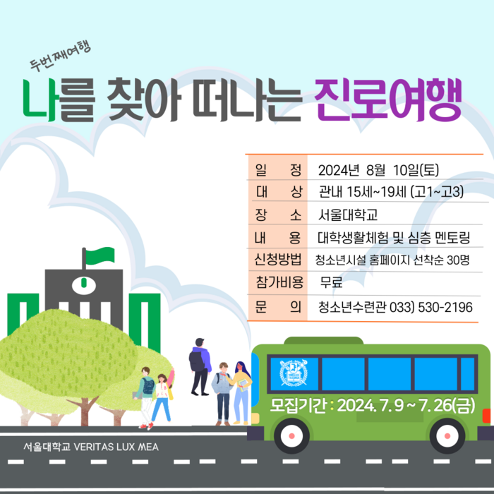 2024년 더나은교육지구사업으로 추진하는 ‘나를 찾아 떠나는 진로 여행’은 지난 6월 가재울청소년메타센터를 방문하였고, 오는 8월 10일에는 두 번째 여행으로 서울대학교를 방문하여 진행할 예정이다.