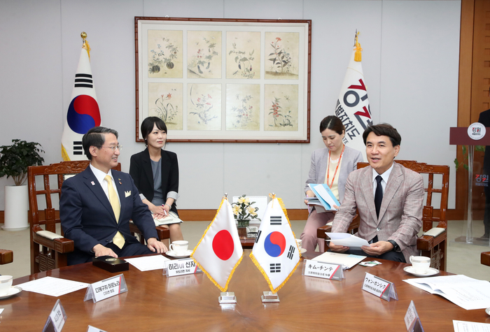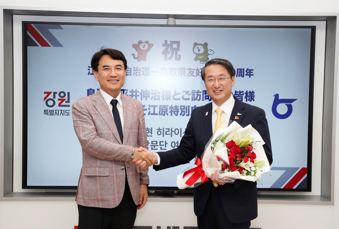 [스포츠서울ㅣ춘천=김기원기자]김진태 강원특별자치도지사는 4일 오전 11시 도청을 방문한 히라이 신지 돗토리현 지사를 현관앞에서 반갑게 맞이했다.