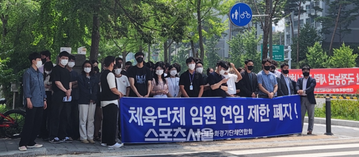 4일 대한체육회 임시대의원총회가 열린 서울 올림픽파크텔 앞엔 체육회 경기단체연합회 등 다수 관계자가 집결, 이런 글귀가 적힌 대형 현수막을 들어올렸다. 이기흥 대한체육회장은 예상대로 총회 모두 발언을 통해 최근 갈등을 빚는 유인촌 문화체육관광부 장관을 저격하는 발언을 이어갔다.