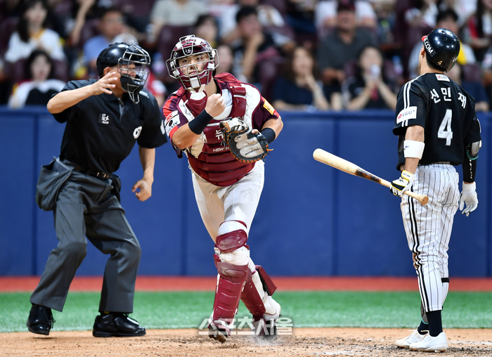 키움 포수 김건희가 4일 고척스카이돔에서 열리는 2024 프로야구 키움히어로즈와 LG트윈스의 경기 7회초 2사 3루에서 신민재를 삼진으로 잡아낸 후 주먹을 불근쥐고 있다. 2024.07.04.
