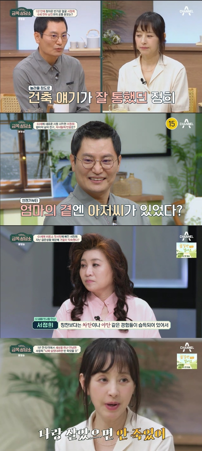 4일 방송된 채널A ‘오은영의 금쪽 상담소’에서 서정희가 교제 중인 6세 연하의 연인 김태현씨와 등장했다. 1년 전에 비해 밝고 건강해진 서정희에 대해 딸 서동주는 “예전에는 엄마가 예민하고 신경질적인 사람인 줄 알았는데 아니더라”라면서 연애 후 애교 넘치는 엄마의 이면을 밝혀 웃음을 자아냈다.