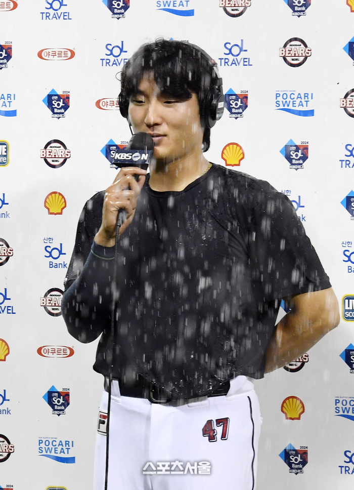 두산 베어스 선발투수 곽빈이 4일 잠실구장에서 열린 2024 KBO리그 롯데 자이언츠와 경기에서 6이닝 무실점으로 승리투수가 된 뒤 갑자기 내린 폭우를 맞으며 수훈선수 인터뷰를 하고 있다. 2024. 7. 4.