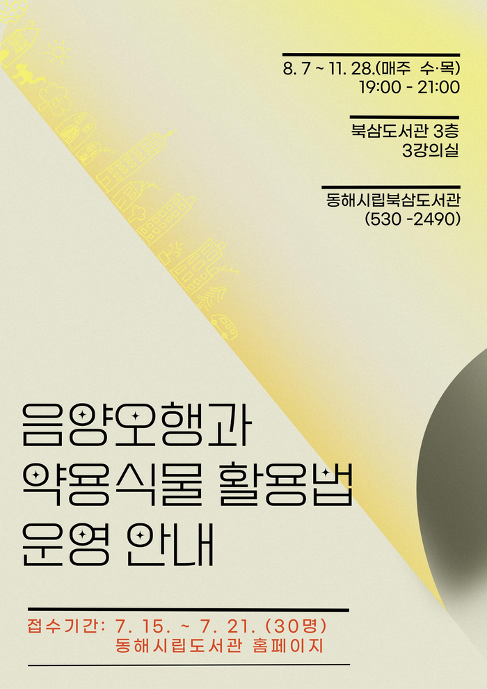 이번 교육은 상반기에 운영한 ‘사상체질과 약용식물 활용법’의 심화 과정으로 북삼도서관에서 8월 7일부터 11월 28일까지 주 2회(수‧목) 오후 7시부터 오후 9시까지 운영한다.