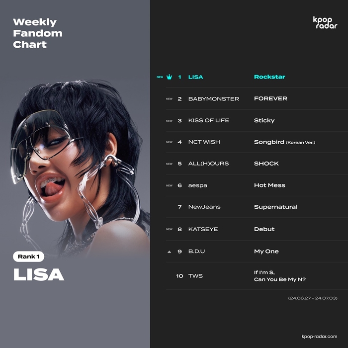이번 주 케이팝레이더에서 발표된 위클리 팬덤 차트의 TOP 10에는 걸그룹 베이비몬스터(BABYMONSTER)의 ‘포에버(FOREVER)’가 2위, 걸그룹 키스오브라이프(KISS OF LIFE)의 ‘스티키(Sticky)’가 3위로 진입했다. 이어 그룹 NCT 위시의 ‘송버드(Songbird)’가 4위로, 그룹 올아워즈(ALL(H)OURS)의 ‘도깨비(SHOCK)’가 5위로 진입했다.