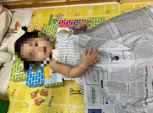 윤진이는 4일 자신의 채널에 “어린이집에서 신문지 덮고 자는 거니 ㅎㅎ”라며 딸의 모습을 공개했다. 양갈래 머리를 귀엽게 묶은 윤진이의 딸은 블럭으로 만든 침대 위에 얌전히 신문지를 덮고 누운 모습으로 웃음을 자아냈다.