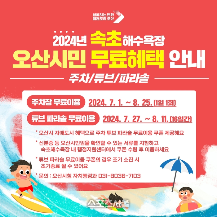 이 기간 속초해수욕장욕장에서 오산시민에게 튜브(대/소)와 파라솔를 무료로 대여한다.