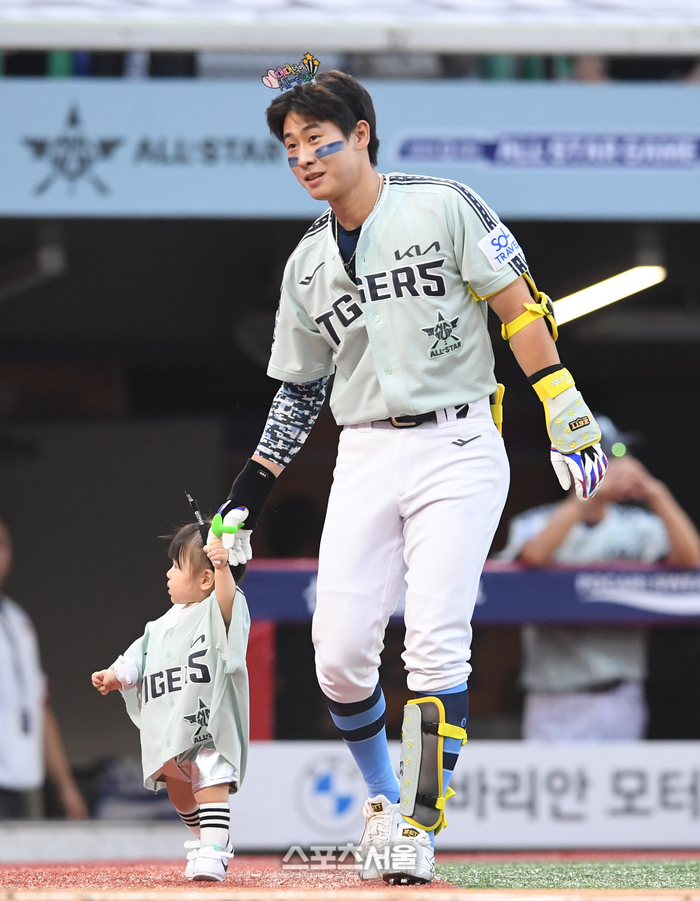 나눔팀 KIA 박찬호가 6일 인천 SSG랜더스필드에서 진행된 2024 KBO리그 올스타전 2회초 딸의 손을 잡고 타석에 들어서고 있다. 2024. 7. 6.