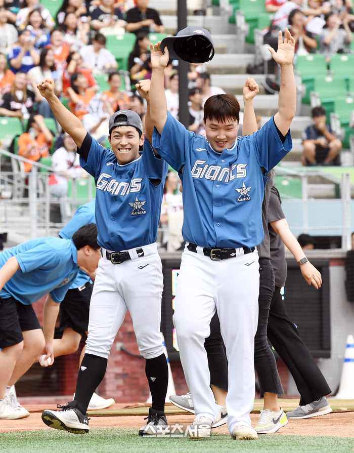 롯데 황성빈(왼쪽)과 정보근(이 6일 인천 SSG랜더스필드에서 진행된 2024 KBO리그 올스타전에 앞서 진행된 썸머레이스에 결승 진출을 확정한 뒤 팬과 함께 기뻐하고 있다. 2024. 7. 6.
