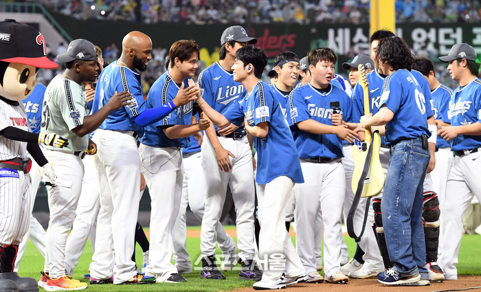 데이식스 멤버들이 6일 인천 SSG랜더스필드에서 진행된 2024 KBO리그 올스타전에서 축하공연을 한 뒤 선수들과 인사를 나누고 있다. 2024. 7. 6.