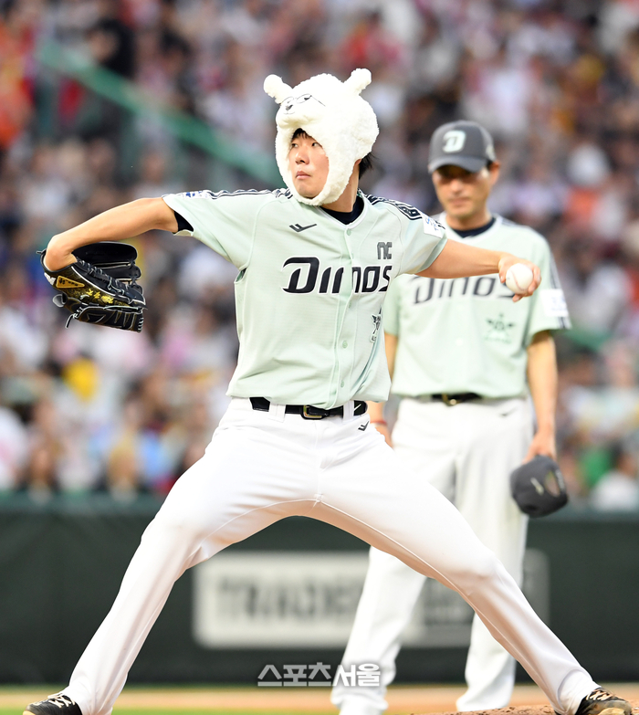 나눔팀 NC 김영규가 6일 인천 SSG랜더스필드에서 진행된 2024 KBO리그 올스타전에서 알파카 모자를 쓰고 투구를 하고 있다. 2024. 7. 6.