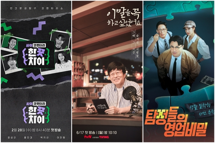 SBS ‘과몰입 인생사’, ‘국민 참견 재판’, MBC ‘도망쳐: 손절 대행 서비스’, 채널A ‘탐정들의 영업비밀’, tvN ‘이 말을 꼭 하고 싶었어요’(이하 ‘이말꼭’), U+ 모바일 ‘그녀가 죽였다’ 등이 올해 방송된 심리 범죄 예능이다.