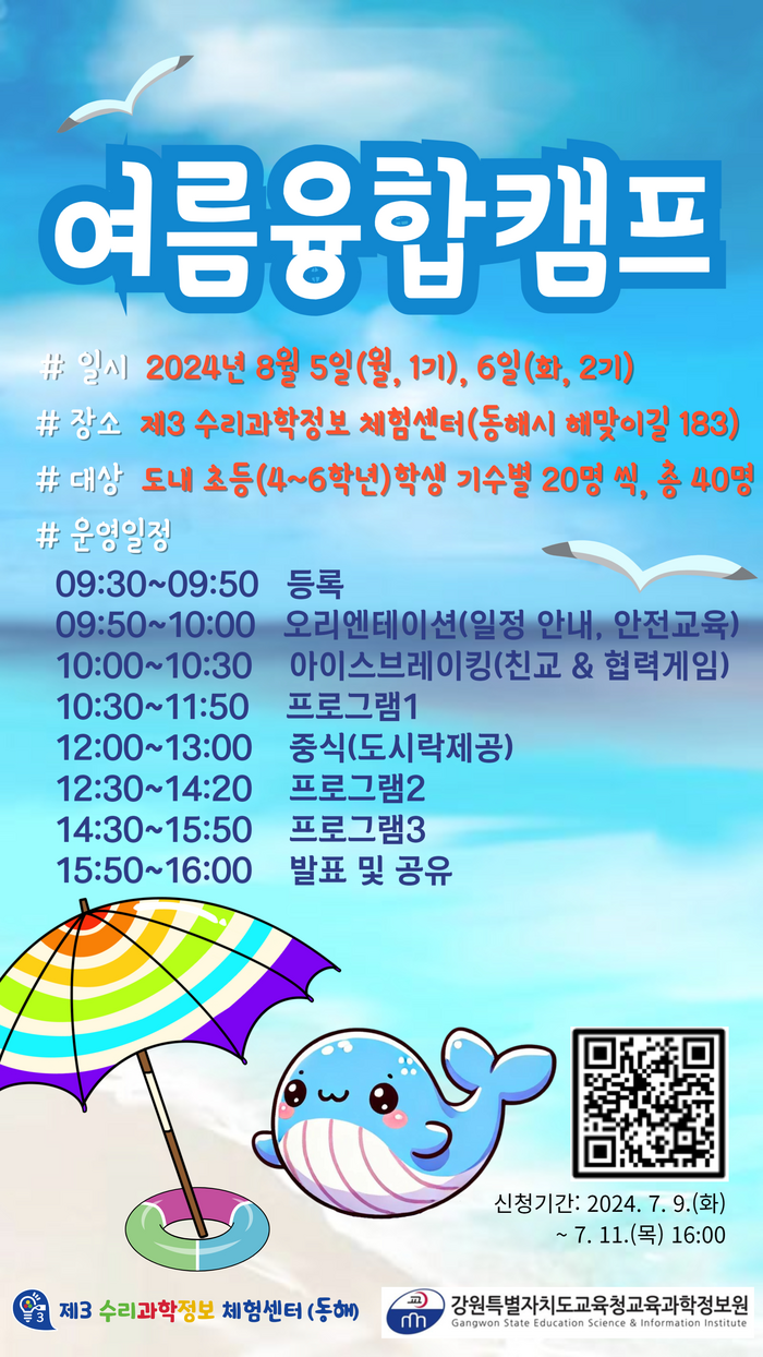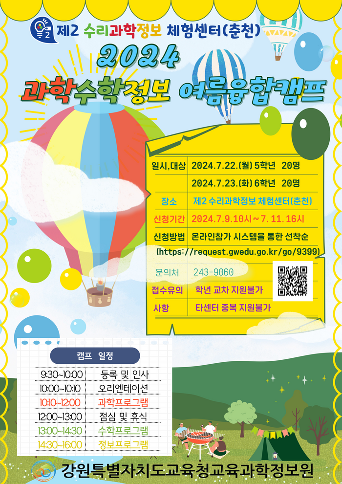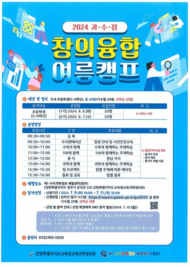 프로그램 신청은 7월 9일(화) 오전 10시부터 11일(목) 오후 4시까지 강원특별자치도교육청교육과학정보원 누리집 온라인 참가 신청 시스템으로 신청할 수 있으며, 선착순으로 모집한다. 자세한 사항은 담당자(원주 033-769-1022, 춘천 033-243-9060, 동해 033-534-1801)에게 문의하면 된다.