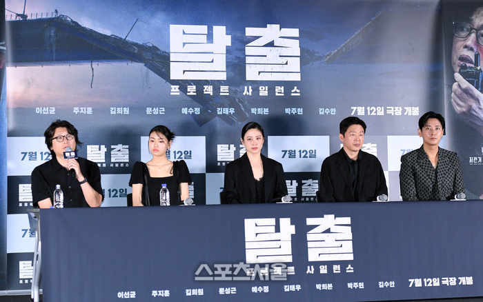 8일 서울 용산구 CGV 아이파크몰에서 진행된 영화 ‘탈출: 프로젝트 사일런스’ 언론 시사회 및 기자간담회에서 김태곤 감독과 출연 배우들이 취재진의 질문에 답을 하고 있다. 왼쪽부터 김태곤 감독, 배우 김수안, 박희본, 김희원, 주지훈.