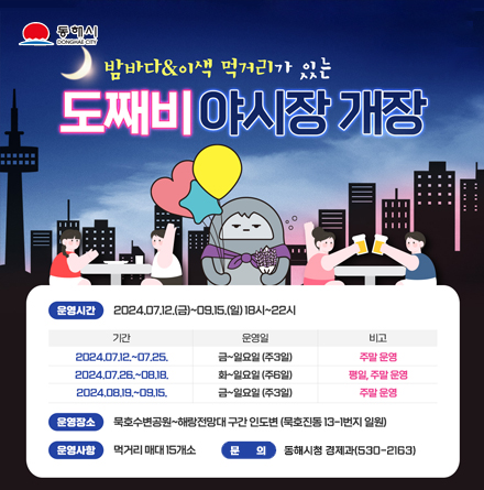 [스포츠서울ㅣ김기원기자]동해시(시장 심규언)가 오는 7월 12일부터 묵호진동 13-1번지 일원(묵호 수변공원~해랑전망대 구간 인도)에서 낭만 가득한 묵호 도째비 야시장을 운영한다고 밝혔다.