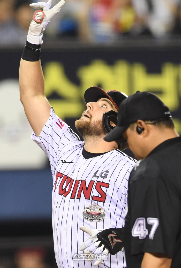 LG 오스틴이 9일 잠실구장에서 열린 2024 KBO리그 KIA와 경기 6회말 무사 1루 상황에서 KIA 선발 네일을 상대로 2점 홈런을 친 뒤 세리머니를 하고 있다. 2024. 7. 9.