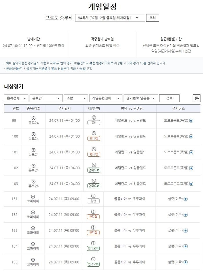 프로토 승부식 84회차에서 ‘유로 2024’ 4강전을 대상으로 하는 게임은 네덜란드-잉글랜드전이며, ▲일반(99번) ▲핸디캡(100번) ▲핸디캡(101번) ▲언더오버(102번) ▲언더오버(103번)으로 즐길 수 있다.