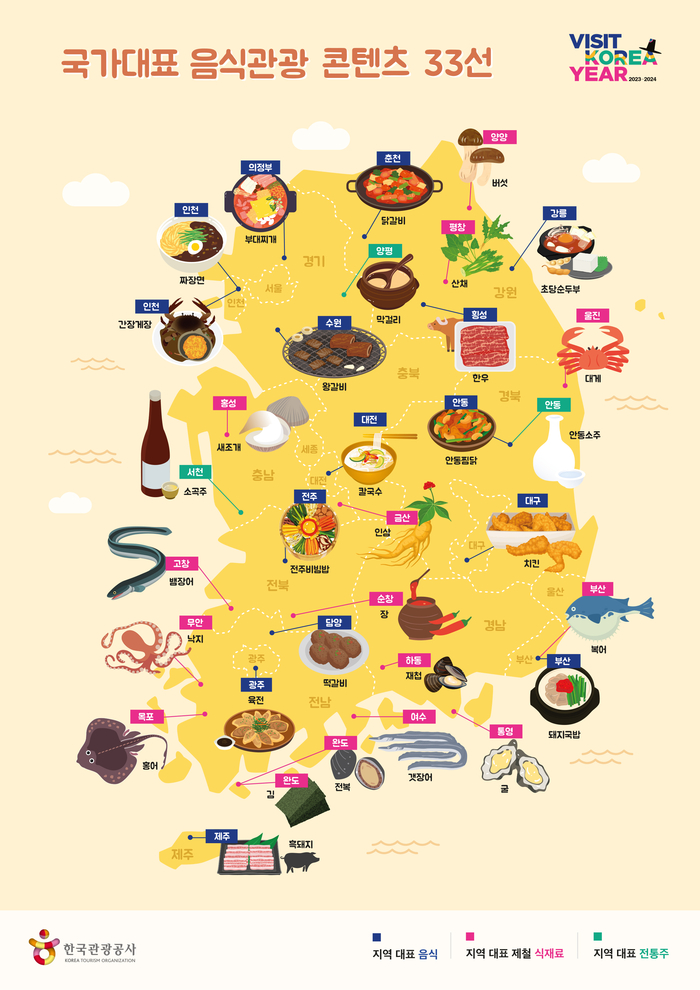 시선을 집중시킨 ‘국가대표 음식관광 콘텐츠 33선’은 각 지역을 대표하고 다른 나라와 차별화되는 한국의 음식 콘텐츠를 3개 주제로 나누어 지역 대표 음식(15종), 지역 대표 제철 식재료(15종), 지역 대표 전통주(3종)로 구성했다.