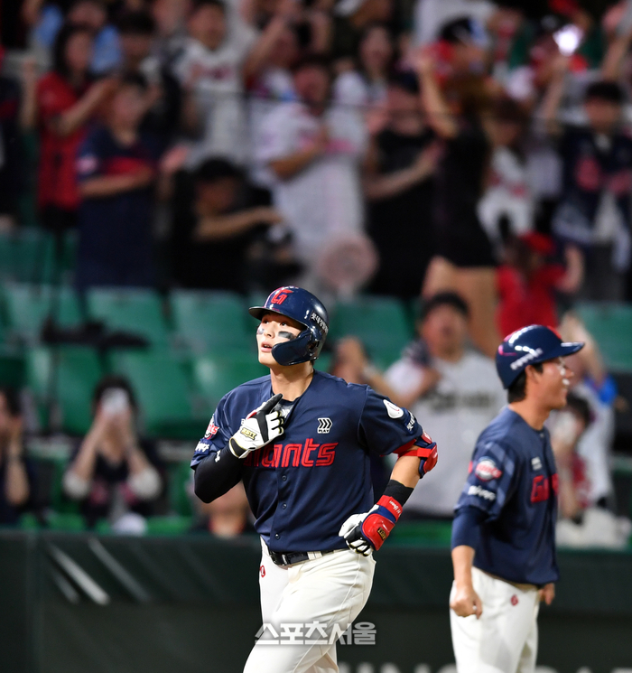롯데 2번타자 윤동희가 10일 인천SSG랜더스필드 열린 2024 프로야구 SSG랜더스와 롯데자이언츠의 경기 9회초 우월1점홈런을 터트린 후 홈인하고 있다. 2024.07.10.