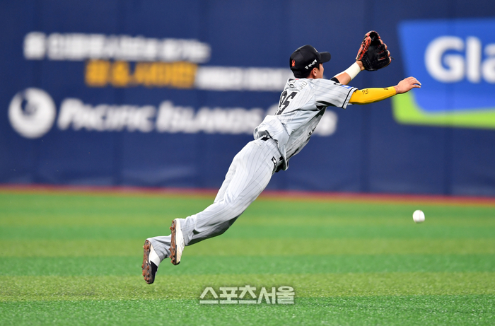 한화 2루수 황영묵이 11일 고척스카이돔에서 열린 2024 프로야구 키움히어로즈와 한화이글스의 경기 3회말 키움 7번타자 김건희의 안타를 잡아내기위해 몸을 날리고 있다. 2024.07.11.