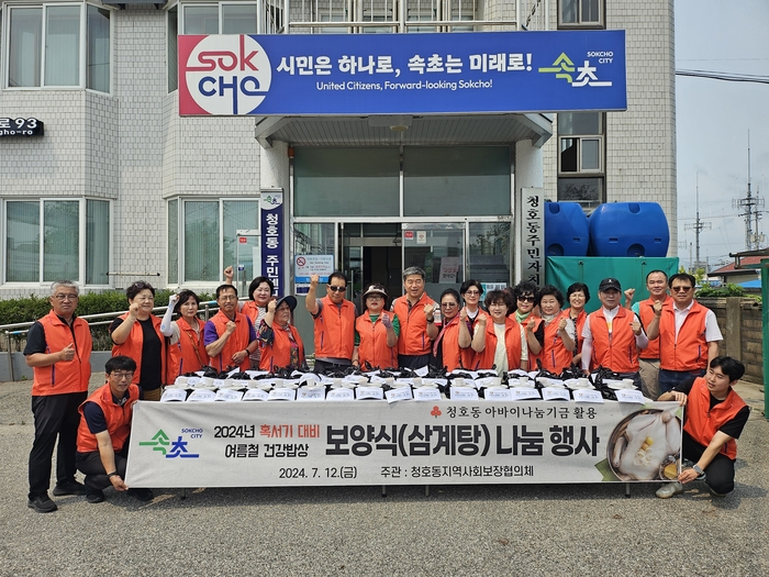 [스포츠서울ㅣ김기원기자]속초시 청호동 지역사회보장협의체(공동위원장 이경수, 윤종원)는 7월 12일 초복을 맞아 관내 취약계층 50가구에 삼계탕과 김치, 즉석밥 등을 전달하고 폭염대비 행동요령에 대한 안내를 진행하며 안전한 여름나기를 지원했다.