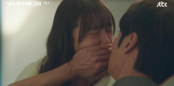 13일 방송된 JTBC 주말극 ‘낮과 밤이 다른 그녀’에서 술김에 입을 맞추려던 이미진(정은지 분)의 계획이 계지웅(최진혁 분)의 방어로 실패에 그쳤다. 계지웅의 손바닥에 키스한 이미진은 창피함에 도망쳤고, 계지웅은 “저번처럼 또 박치기할까 봐 나는” 이라며 민망해했다.