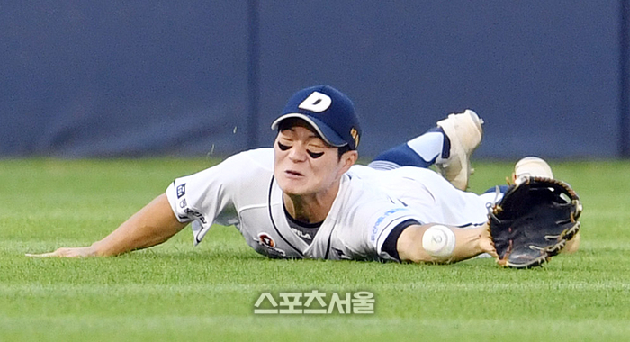 두산 좌익수 전다민이 14일 잠실구장에서 열린 2024 KBO리그 삼성과 경기 7회초 2사 2루 삼성 이재현의 동점 1타점 2루타 때 타구를 놓치고 있다. 2024. 7. 14.