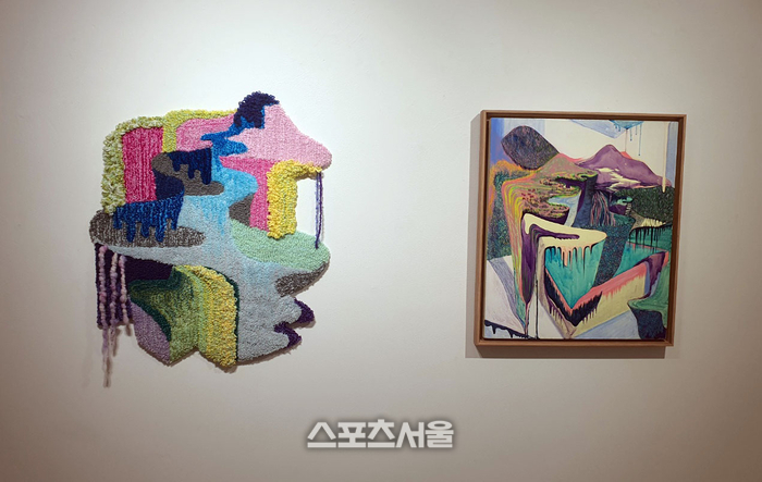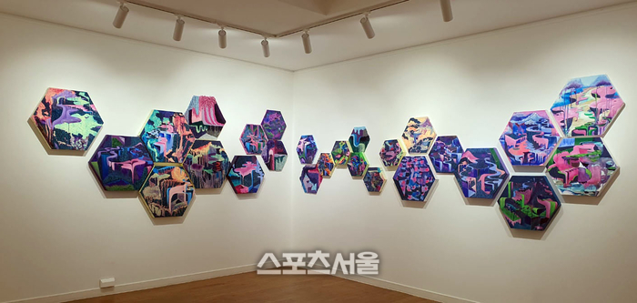 이번 전시에서 눈에 띄는 것은 육각형의 캔버스와 터프팅 작품이 어우러진 공간구성이다. 이 모든 작품들은 공간에 따라 배치가 달라지는 모듈형식으로 이루어져 다른 공간에서 작품이 전시될 때는 모듈의 구성과 배치를 달리해 또 다른 느낌의 설치가 이루어질 수 있어 매우 흥미롭다.