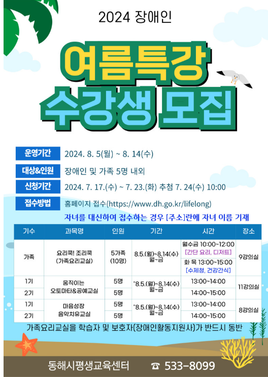 장애인 여름 특강 모집은 7월 17일부터 7월 23일까지 동해시학습관 홈페이지를 통해 온라인으로 접수를 한다. 모집대상은 동해시 거주하는 장애인이면 누구나 신청할 수 있고 수강료는 무료이다,