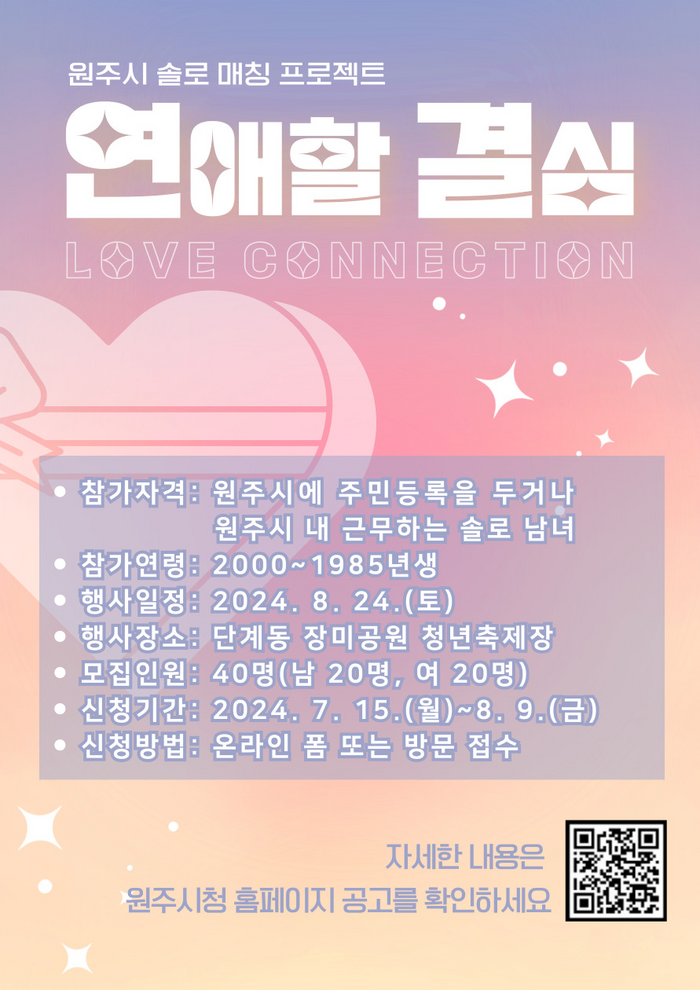 [스포츠서울ㅣ원주=김기원기자]원주시는 관내 미혼 청년들에게 소통과 교류의 기회를 제공하는 ‘원주시 솔로 매칭 프로젝트 「연애할 결심」’ 참가자를 모집한다.
