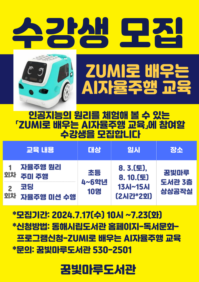 [스포츠서울ㅣ김기원기자]동해시(시장 심규언)는 ‘공공도서관 디지털시민 교육 지원사업’으로 동해꿈빛마루도서관에서 ‘ZUMI(주미)로 배우는 AI자율주행 교육’을 운영한다고 밝혔다.