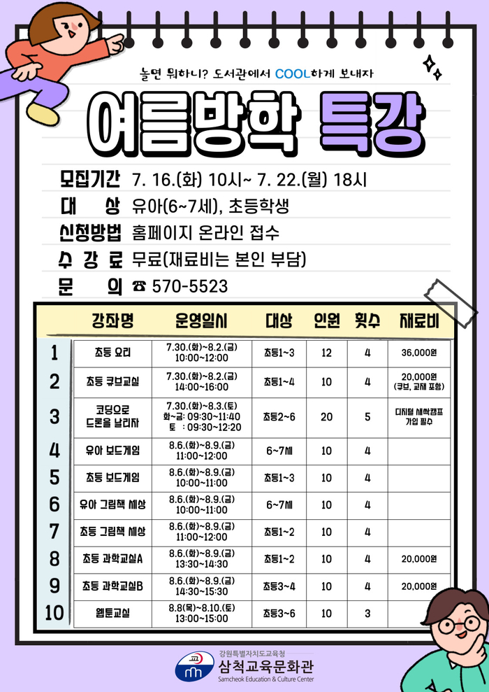 [스포츠서울ㅣ김기원기자]강원특별자치도교육청삼척교육문화관(관장 김범중)은 7월 16일(화)부터 22일(월)까지 유아 및 초등학생을 대상으로 여름 방학 특강 수강생을 모집한다.