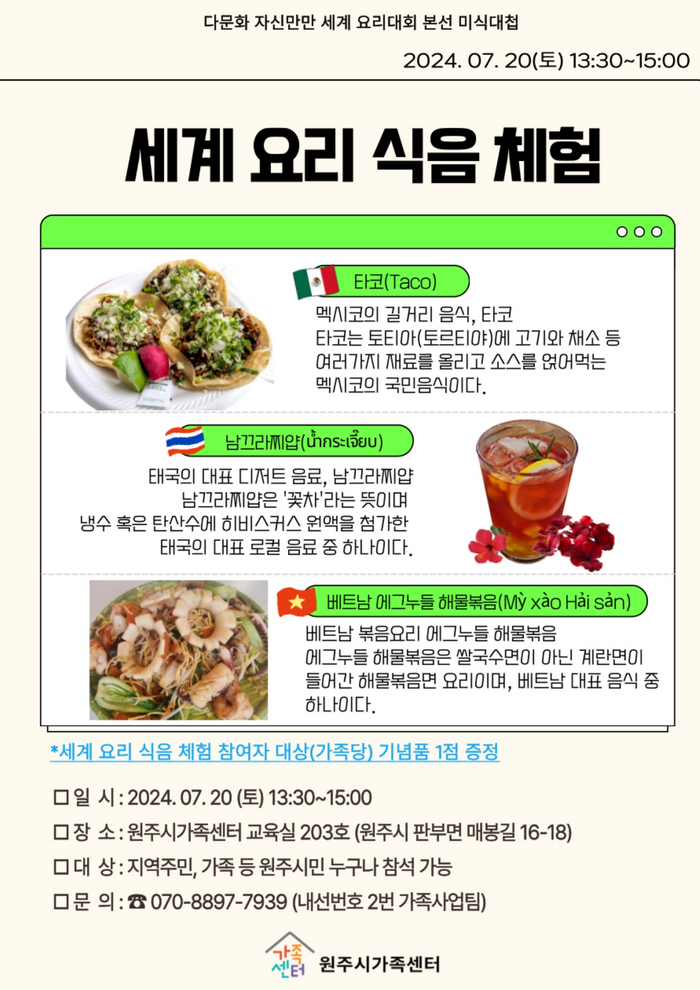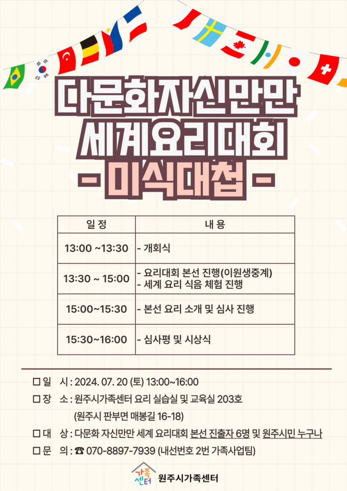 남궁은임 원주시가족센터장은 “본선 대회와 함께 세계 요리 식음 체험도 진행하여 지역주민의 다문화에 대한 이해가 향상되는 기회가 될 것으로 기대한다”고 전했다.