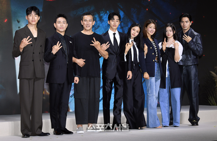 배우 김무열(왼쪽부터), 오정세, 유오성, 진영, 고민시, 이시영, 김시아, 이진욱이 17일 서울 종로구 JW 메리어트 동대문 스퀘어에서 진행된 넷플릭스 시리즈 ‘스위트홈’ 시즌3 제작발표회에서 취재진을 향해 포즈를 취하고 있다.