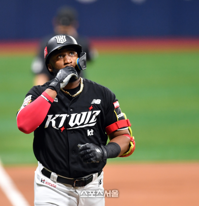 KT 1번타자 로하스가 17일 고척스카이돔에서 열린 2024 프로야구 키움히어로즈와 KT위즈의 경기 1회초 선두타자로 나와 헤이수스를 상대로 좌월1점홈런을 터트린 후 홈인하고 있다. 2024.07.17.