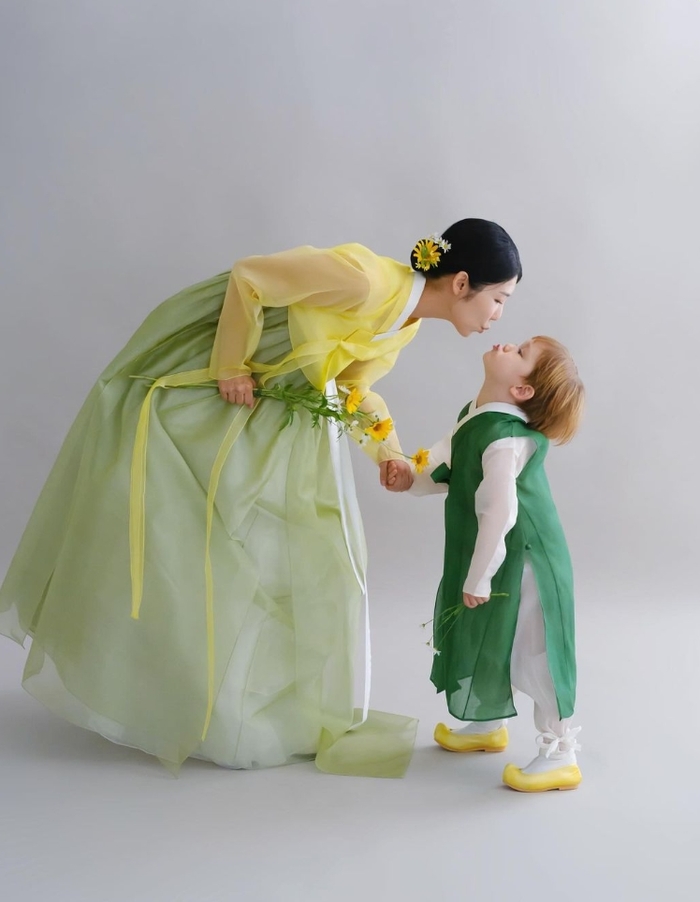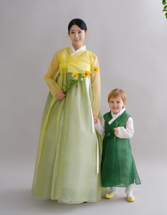 사유리는 샛노란 색 저고리에 연두색 치마를 입고, 젠은 초록색 조끼에 노란 신발로 싱그러운 시밀러룩을 선보였다.